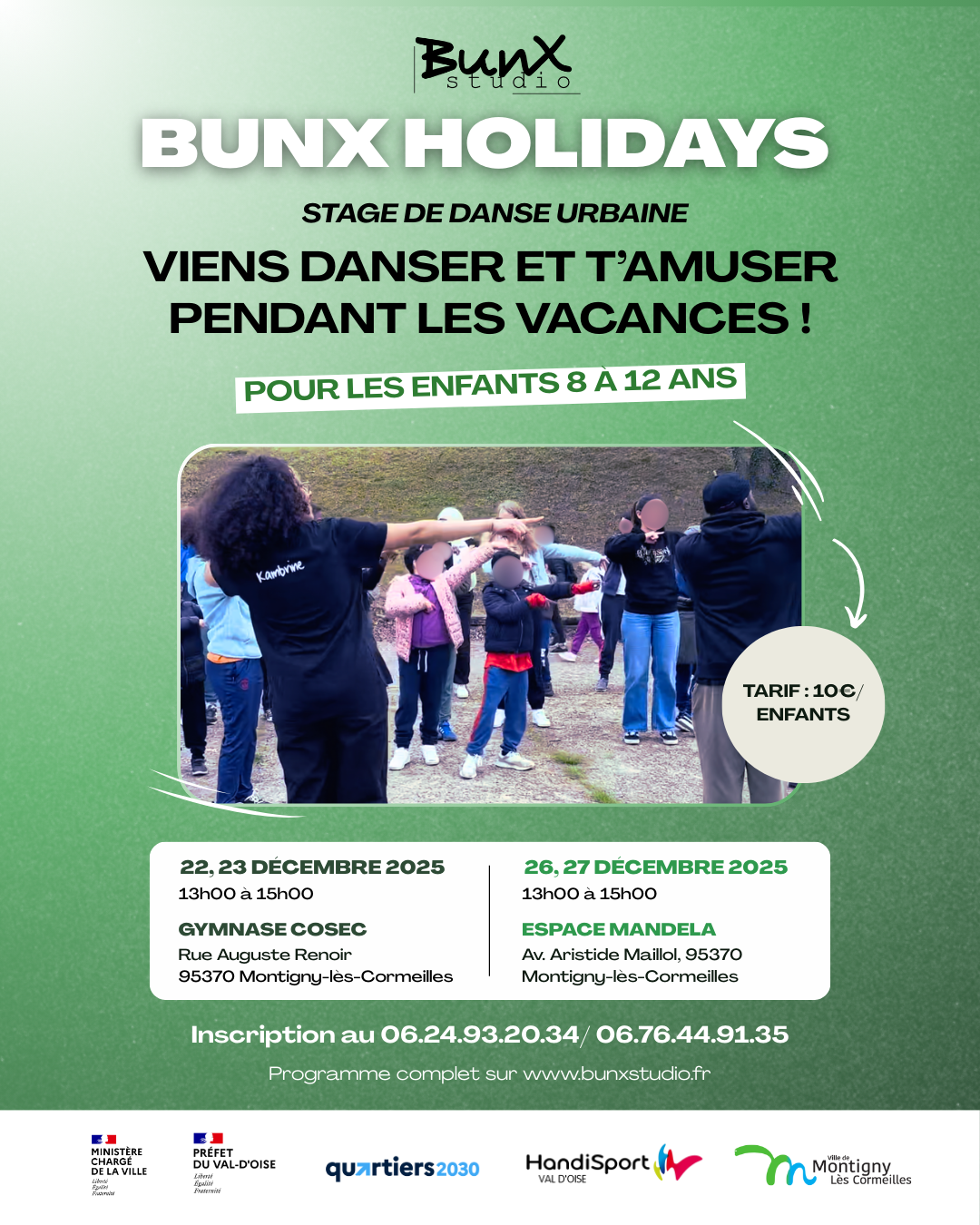 Le stage BUNX HOLIDAYS est fait pour toi ! Viens vivre 4 après-midis 100 % fun, entouré(e) d’intervenants passionnés et d’une ambiance au top. Que tu sois débutant(e) ou déjà fan de danse, tu repartiras avec de nouveaux pas, de belles rencontres et plein de souvenirs !